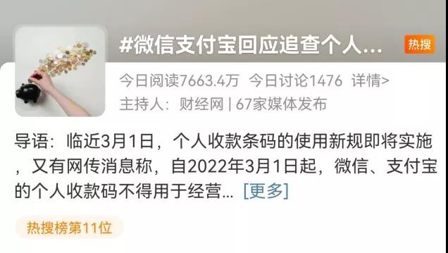 據(jù)媒體報道,近期有網(wǎng)傳消息稱,自2022年3月1日起,微信、支付寶的個人收款碼不得用于經(jīng)營性收款。不僅如此,近4年的數(shù)據(jù)將被追查,一旦數(shù)額較大需按4.5%補稅,還要繳納滯納金和罰款。對此,微信和支付寶回應稱,追查個人收款碼近4年數(shù)據(jù)的說法為謠言。